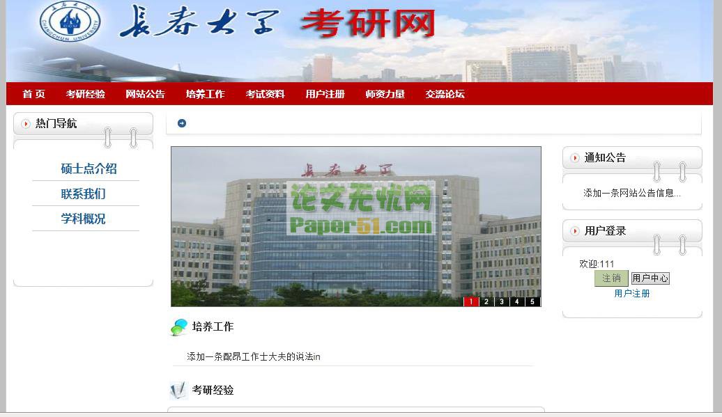 设计并开发长春大学考研网站就要对整个系统的需求和流程进行分析,所以本节我们主要对长春大学考研网站的整个流程进行需求分析。整个网站的具体功能需求包括下面几个方面: 用户注册:系统将验证用户是否存在,以及用户信息是否合法。 用户登录:系统将验证用户是否存在,输入信息是否正确。 账号管理:主要实现对使用后台用户的管理员信息的添加、修改和删除操作。 学生信息管理:主要功能是对学生的注册信息的管理。 长大硕士点介绍:介绍长大硕士点的各种信息。 教师介绍:介绍长大硕士点的教师信息。 题库和考点分析:实现对题库信息,考点信息的管理。 考研论坛:实现一个小型的论坛系统,帮助学生在线交流讨论。 考研经验信息:实现对考研经验进行的添加,修改,删除和前台显示的功能。 ![]() ![]() |