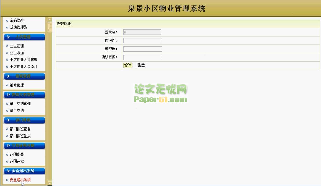 4.1系统总体功能方案 本系统拟采用开发工具myeclipse进行程序的开发,数据库mysql进行数据库的设计。通过对居民缴费情况的调查得出系统需要管理的缴费信息。进行功能模块的划分,并依据高内聚低耦合的设计原则设计各功能模块,并分配好各模块的输入输出信息。最后在进行程序及数据库的设计。 4.2系统目标 本系统拟需要实现以下功能: (1)管理员管理:对用户的管理,查看所有用户信息, (2)人员管理:包括业主、物业管理员、维修员、保洁人员的添加、删除等。 (3)维修管理:业主报修信息的查看与受理等。 (4)费用交纳管理:包括水费、电费、物业费、电梯费、地上车位费、地下车位费的交纳。 (5)部门排班管理:物业人员的排班信息的录入与管理。 (6)单据证明管理:为业主开房产证明、公共维修基金、户口证明等单据。 (7)报修:业主对损坏的东西进行报修申请。 (8)我的报修:业主查看自己的所有报修信息包括报修处理状态。 (9)我的缴费:业主查看自己的所有缴费信息。 ![]() ![]() |