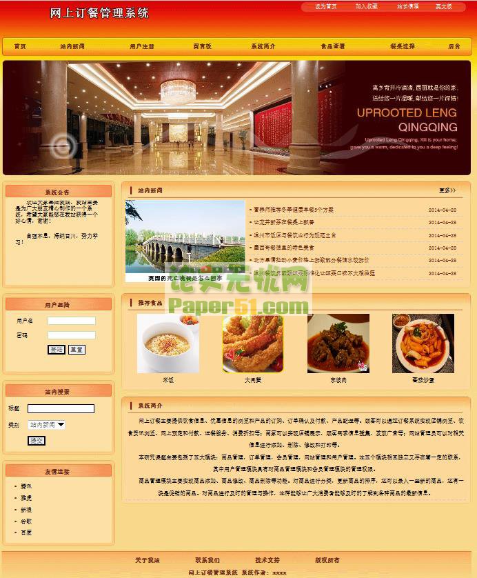 用户的需求具体体现在各种信息的提供、保存、更新和查询方面,这就要求数据库结构能充分满足各种信息的输入和输出。收集基本数据、数据结构及数据处理的流程,组成一份详尽的数据字典,为后面的具体设计打下基础。 通过系统功能分析,针对一般的网上订餐管理,总结出如下的需求信息: 1)用户分一般用户、注册用户和管理员用户。 2)一般用户和注册用户无需要登录就可以查看餐饮信息和资讯 3)注册用户登录后可以进行餐饮预定。 4)管理员可进行所有后台操作权限。 关于定单列表与定单详细信息可以这样理解:因为用户一次可以购买多种产品。则对每种产品(即每一款型号的菜单)生成一条定单详细信息记录。然后多个这样的定单详细信息组成一个定单列表。每一个定单列表才与一个用户对应,在发货时以定单列表为单位,也即用户在操作时所看到的“定单”。 经过系统功能分析和需求总结,考虑到将来功能上的扩展,设计如下的数据项和数据结构: 1)用户信息,包括数据项:帐号,密码,权限,注册时间。 2)公告,包括数据项:公告名称,公告内容,添加时间等。 3)菜单,包括数据项:菜单编号,菜单名称,菜单说明,价格,图片等。 内容来自论文无忧网 www.paper51.com 4)定单列表,包括数据项:定单列表编号,用户编号,下单时间,联系方式等。 ![]() ![]() |