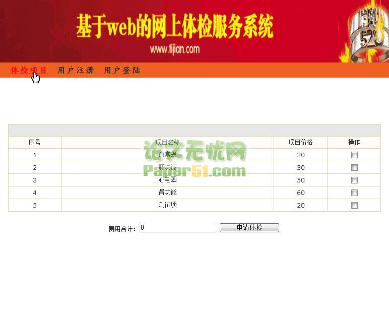 摘 要 近几年来,随着人民生活水平大幅度提高,国家对医疗卫生改革的大力推进,医院的医疗业务也逐年快速地增长,医院管理的信息化、数字化成为医院实现资源整合、流程优化,降低运行成本,提高服务质量、工作效率和管理水平的有力手段。加快信息化、数字化建设是深化医院改革、促进医院发展的必然要求。 传统的手工管理已经无法满足医院健康体检中心工作的需求,医院个人体检管理系统的设计与实现,有利于健康体检流程再造,提高工作效率,规范业务流程。为社会健康和亚健康人群进行更好的健康保健、亚健康调整促进和疾病预防等服务。同时,健康体检信息管理系统也是医院信息化、数字化的一个重要组成部分。 本课题是针对目前广泛开展的健康体检工作,为提高体检效率、降低成本、规范体检业务流程、方便体检人群、实现整合资源而设计的医院个人体检管理系统。系统主要分为三类用户,分别是普通用户、医生用户和系统管理员。普通用户部分包括用户注册与登录、申请体检和查看体检,医生用户部分主要是体检数据管理,系统管理员部分包括普通用户和医生用户的管理、体检项目管理和体检缴费管理等功能。本系统前台主要使用JSP作为开发语言,后台使用MySQL作为数据库管理系统,开发环境是MyEclipse,服务器采用tomcat,开发出的一个基于Web技术的B/S结构的医院个人体检管理系统。 paper51.com 关键词:体检管理;JSP;B/S Abstract In recent years, with people's living standards greatly improved, the national push for health care reform, the hospital medical business is growing rapidly year by year, and the management of hospital informationization, digitization become hospital to realize resource integration and process optimization, reduce operating costs, improve service quality and work efficiency and management level of the powerful means. Accelerate the construction of informatization, digitization is deepening hospital reform, inevitable requirement to promote the development of the hospital. The traditional manual management has been unable to meet the needs of hospital physical examination center, hospital management system, the design and implementation of private medical insurance is helpful to health check-up process reengineering, improve work efficiency, standardize business processes. For the social health and sub-health population to better health care, the health promotion and disease prevention services such as adjustment. At the same time, the physical examination information management system is an important part of hospital digitization and informatization. 内容来自www.paper51.com This topic is based on the current extensive health physical examination work, in order to improve medical efficiency, reduce cost, standardization of medical business process, convenient check-up crowd, realize resource integration and individual design of hospital medical management system. System mainly divided into three categories, respectively is ordinary users, the doctor users and system administrators. Ordinary users part includes user registration and login, apply for examination and check the physical examination, the doctor user part mainly check-up data management, the system administrator includes user management, examination of the ordinary users and doctors pay cost management functions such as project management and examination. This system at the front desk mainly using JSP as a development language, the background using MySQL as the database management system, the development environment is MyEclipse, server using tomcat, developed a Web technology based B/S structure of individual physical examination management system of hospital. 内容来自论文无忧网 www.paper51.com Key Words:Medical management 、JSP、B/S 目 录 摘 要 II Abstract III 第1章 概述 1 1.1 课题背景与意义 1 1.2开发工具及技术 1 1.2.1 MyEclipse 1 1.2.2 Tomcat 2 1.2.3 MySQL 2 1.2.4 JSP技术 3 第2章 系统分析 5 2.1可行性分析 5 2.1.1技术可行性 5 2.1.2经济可行性 5 2.1.3社会可行性 6 2.2总体设计原则 6 2.3功能模块分析 7 第3章 系统设计 10 3.1系统功能设计 10 3.2数据库设计 10 3.2.1概念结构设计 10 3.2.2数据库表设计 12 3.3数据库连接 14 第4章 系统实现 17 4.1登陆与注册界面设计 17 4.2用户信息管理 21 4.3体检项目管理模块 21 4.4医生信息管理模块 22 4.5体检缴费模块 23 4.6用户体检模块 23 4.7体检数据管理模块 24 第5章 软件测试 26 5.1软件测试的重要性 26 5.2测试实例的研究与选择 26 5.3测试环境与测试条件 27 5.4系统运行情况 28 http://www.paper51.com 5.5系统评价 28 第6章 结论 29 参考文献 30 致谢 32 ![]() ![]() ![]() ![]() |
