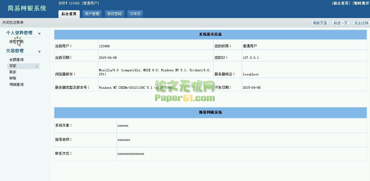 网上银行(Internetbank or E-bank),包含两个层次的含义:一个是机构概念,指通过信息网络开办业务的银行;另一个是业务概念,指银行通过信息网络提供的金融服务,包括传统银行业务和因信息技术应用带来的新兴业务。在日常生活和工作中,我们提及网上银行,更多是第二层次的概念,即网上银行服务的概念。网上银行业务不仅仅是传统银行产品简单从网上的转移,其他服务方式和内涵发生了一定的变化,而且由于信息技术的应用,又产生了全新的业务品种。 因此,社会信息化建立工作拥有持久性、丰富性和实质的多变性;由于这样,网银系统也不是一个简便的、封锁的、停止的系统,而是一个丰富的、开放的、在应用的深度和广度上,跟着时间的推迟会渐渐改变和成长的系统。 本系统采用php编程语言加mysql数据库进行开发,二者搭配使得网站开发变得根据简单和实用,开发出该系统大大减轻了的工作量,增加了工作效率。 关键词:PHP;网银;系统 目 录 摘 要 I ABSTRACT II 目 录 III 摘 要 I 第1章 导言 1 1.1发展现状 1 1.2系统开发背景 1 1.3本设计的主要内容 2 内容来自论文无忧网 www.paper51.com 第2章 关键技术介绍 3 2.1关于 HTML的简介 3 2.2 PHP的技术 5 2.2.1 PHP 的简介 5 2.2.2 PHP开发平台 6 2.2.3 PHP文件的组成 7 2.3 进行访问数据库的实现方法 7 2.4 MYSQL数据库 8 2.4.1 关于MYSQL解释 8 2.4.2MYSQL特点特性 9 2.4.3 MYSQL数据库应用环境 9 2.5APACHE解释 10 第3章 系统分析与设计 11 3.1概述 11 3.2需求的分析 11 3.2.1需求的分析概述 11 3.3 系统设计 11 3.3.1系统功能的设计 11 3.3.2系统的用例分析 12 3.3.3数据库设计 13 第4章 系统实现 16 4.1 网站设计 16 4.1.1登录模块 16 4.1.2管理员主页面模块 20 4.1.3首页模块 21 第5章系统调试跟系统测试 22 5.1 程序的调试 22 5.2 一般程序的调试 22 5.2.1登录测试 22 5.2.2增加测试 22 5.2.3测试查询 23 5.2.4主页面的登录模块测试 23 结 论 25 参考文献 26 致 谢 27 ![]() http://www.paper51.com ![]() ![]() |