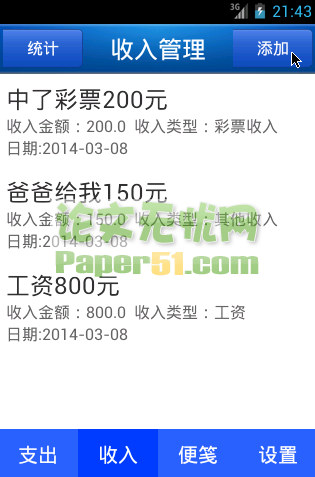 摘 要 随着移动平台的崛起,越来越多的传统PC软件被移植到移动平台,比如ipad,iphone,Android等智能终端设备,在这些平台中,Android占领着最大的市场份额,所以为Android用户开发满足日常使用的软件成为了现在的一大热门。 本次设计选用了时下比较热门的Android平台来作为开发技术,实现了一个生活小管家软件,用户可以通过该小软件来管理自己日常生活中的费用支出和收入情况,可以统计每个月的支出收入情况。 本论文将逐步介绍基于Android平台的移动生活小管家的开发背景和意义,接着详细介绍了本系统的分析、设计与实现过程,最后对本论文做了总结。 关键字:Android、生活小管家、SQLite、手机 目 录 摘 要 2 ABSTRACT 3 目 录 1 前言 1 1 绪 论 2 1.1课题的研究背景 2 1.2本课题研究现状 2 1.3本文研究内容 3 1.4本论文框架介绍 3 2相关技术及开发平台 5 2.1 开发工具及环境简介 5 2.2 Android系统 6 2.2.1 Android Features特性 6 2.2.2 Android系统的四大组件 7 3 系统分析 9 3.1概述 9 内容来自论文无忧网 www.paper51.com 3.1.1系统分析的原则 9 3.1.2系统分析的方法 9 3.2性能需求分析 10 3.2.1 实用性原则 10 3.2.2 可扩展性与可维护性原则 10 3.2.3 安全可靠性原则 10 3.2.4 用户界面美观原则 10 3.2.5 准确性与原则性原则 11 3.2.6 易用性原则 11 3.3 系统可行性分析 11 3.1.1 经济可行性 11 3.1.2 技术可行性 11 3.1.3 操作可行性 12 3.4 系统功能需求 12 3.5 系统使用流程分析 12 4 系统设计 14 4.1 系统设计目标 14 4.2 系统功能模块设计 14 4.3 数据库设计 15 4.4 工程文件结构设计 18 5 系统实现 21 5.1用户登录界面 21 5.2用户注册界面 23 5.3收入管理界面 26 5.4支出管理界面 27 5.5统计管理界面 29 5.6系统设置模块 31 6 系统测试 31 6.1测试的重要性 31 6.2测试的目的 32 6.3收入记录测试 33 总 结 35 致 谢 36 参考文献 37 附 录 38 内容来自www.paper51.com ![]() |